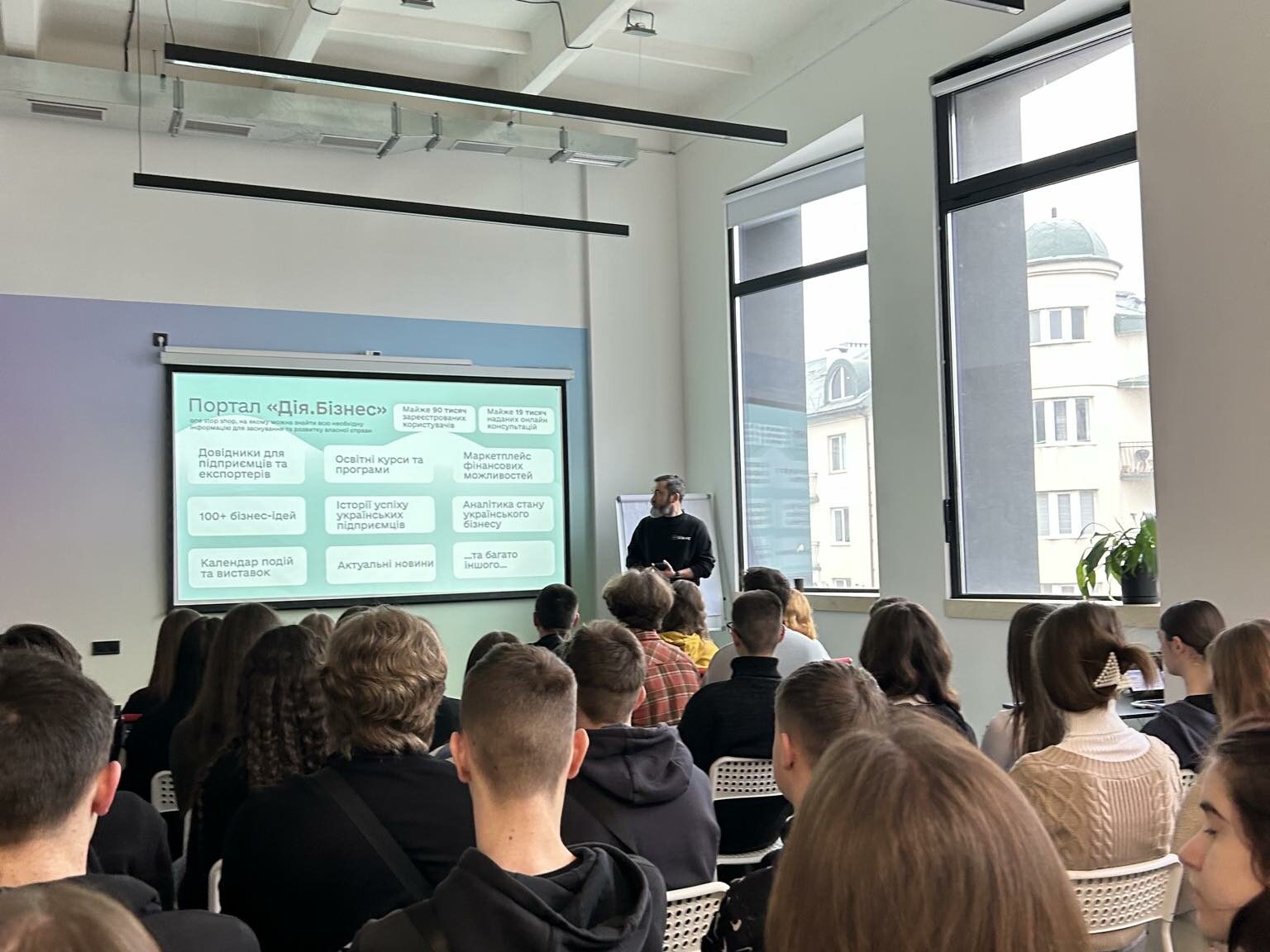 Керівництво та експерти Центру Дія.Бізнес провели захопливу презентацію про діяльність та послуги, які надає Центр. Особливу увагу було приділено можливостям цифрового додатку Дія.Бізнес, завдяки чому студенти дізналися про корисні лайфхаки та можливості.